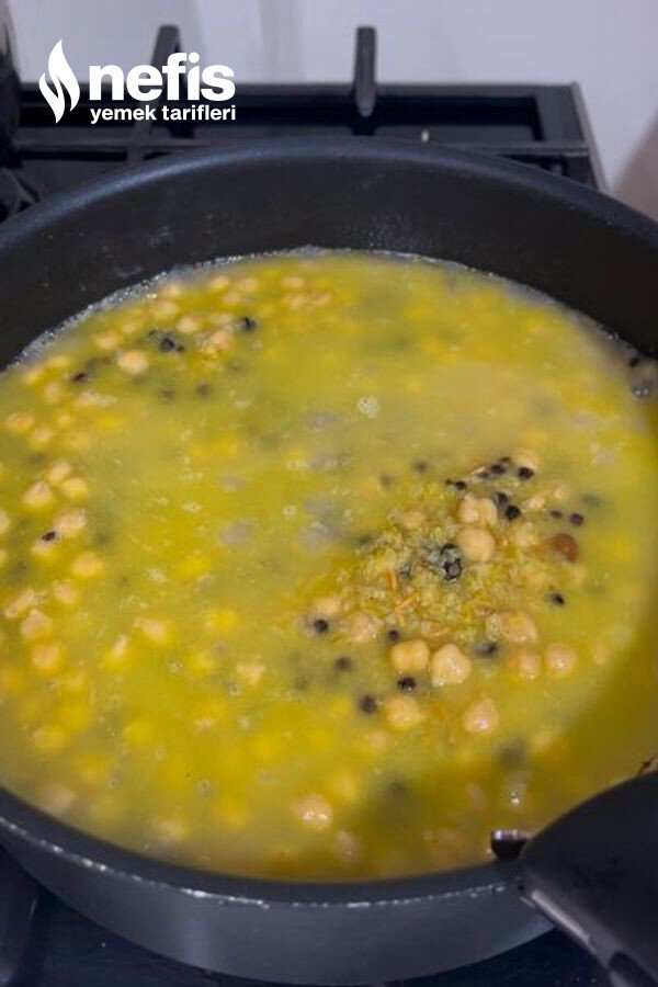 - Haşlanmış nohut ve yıkadığımız kuş üzümlerini de ekledikten sonra tuzunu ve suyunu ekleyip kapağını kapatalım.