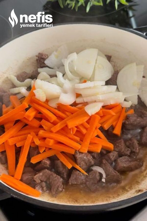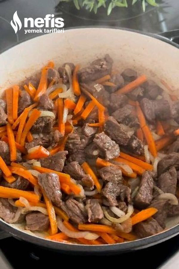 - Suyunu çeken etlerin üzerine soğan, havuç, tuz ve karabiber ekleyip kavurmaya devam edelim.