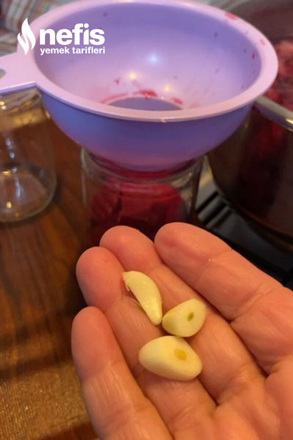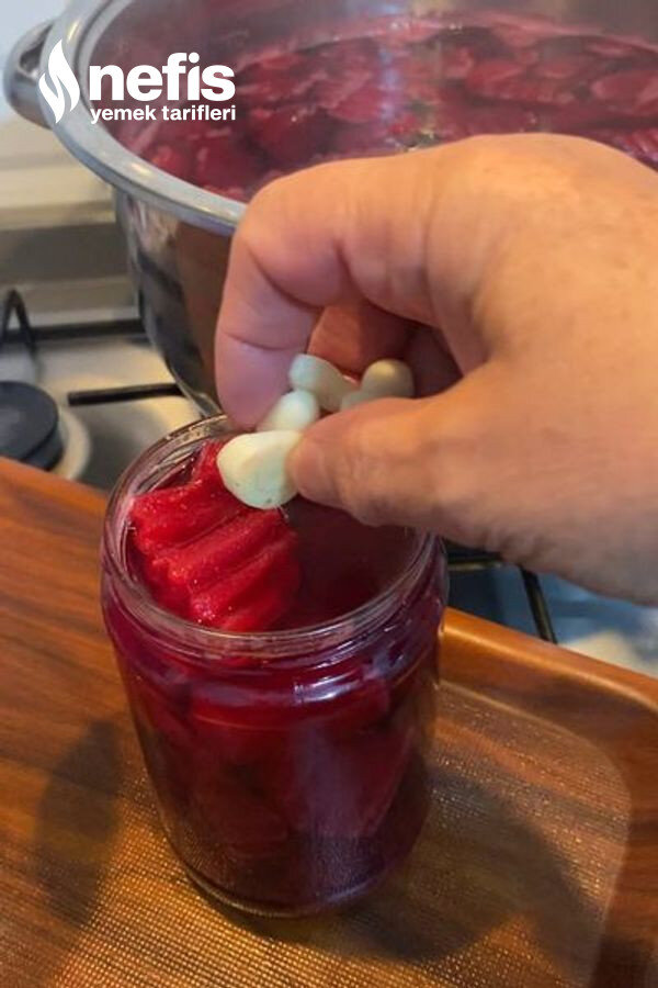 - Kaynarken kavanozlara evvel pancardan sonrada suyundan dolduruyoruz bir litre kavanoz için 3-4 diş sarımsak ekliyoruz.