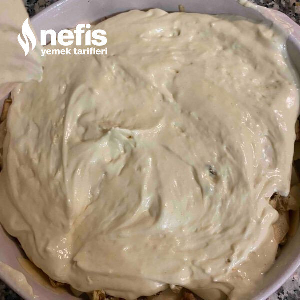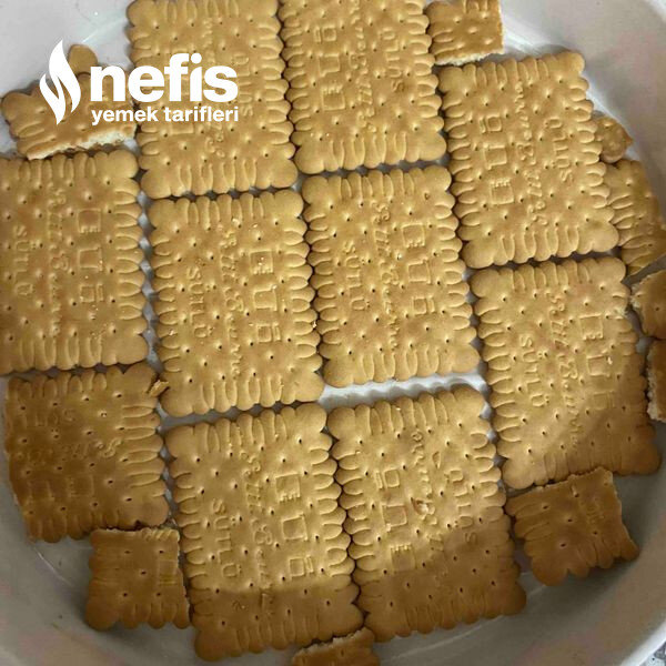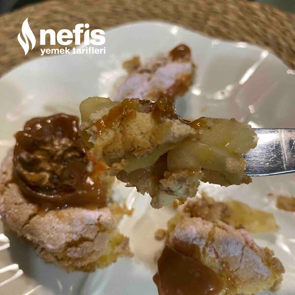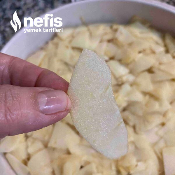 - Tepsinin altına petibörleri diziyoruz üzerine çok ince kıyılmış elmaları diziyoruz, üzerine ceviz tarçın ekleyip, hamurumuzu istikrarlı biçimde elmaların üzerine döküyoruz.