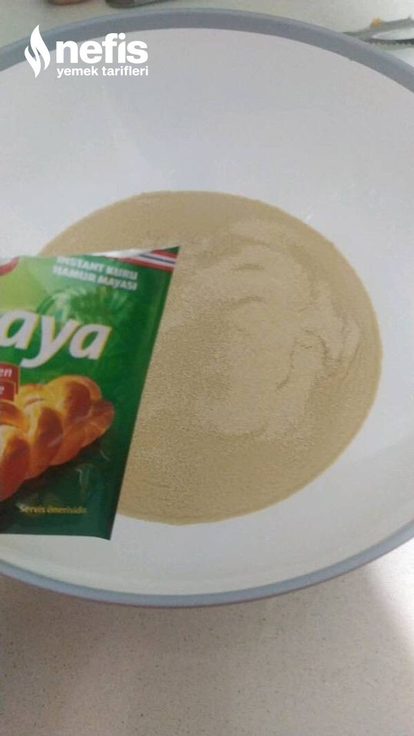 - Önce ılık suyu hamuru yoğuracağımız kaba koyup içine bir paket maya ve şekeri koyup karıştıralım daha sonra sıvı yağ ve tuzu koyup unu yavaş yavaş denetimli olarak ekleyip hamuru yoğuralım hamurun kulak göğsü yumuşaklığından.