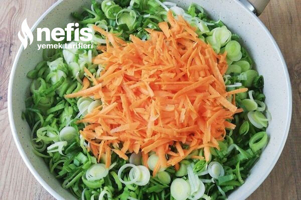 - Pırasayı incecik doğrayıp havucu rendeleyin.