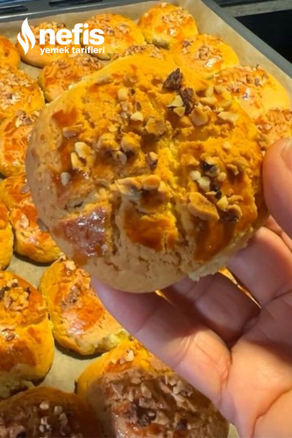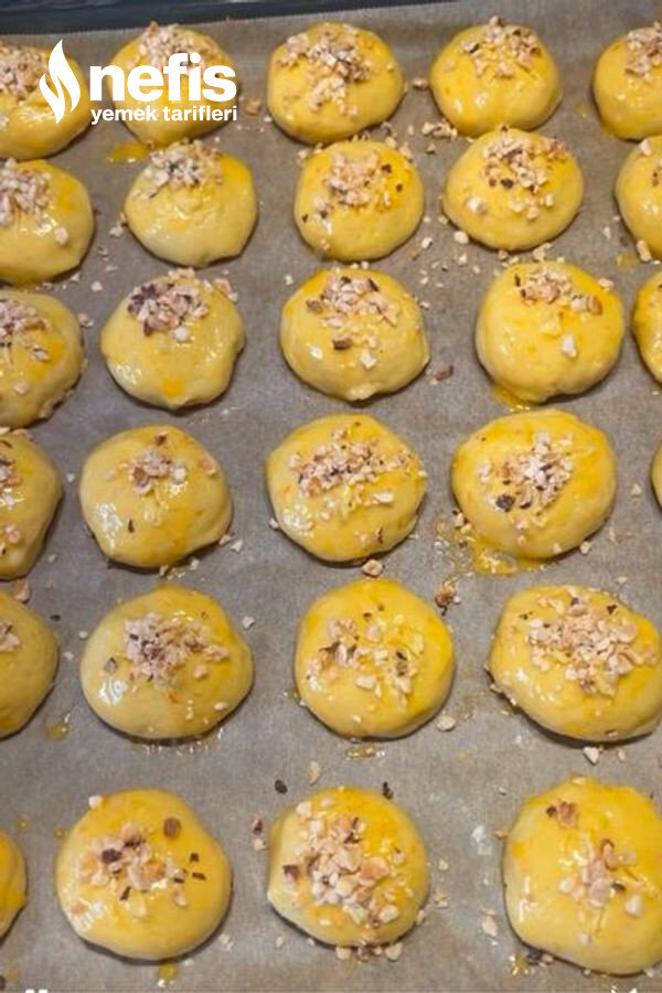- Yağlı kağıt serili tepsiye aralıklı dizip üzerine yumurta sarısı sürüp üzerine bıçakla çizik atıp, kırılmış ceviz yahut fındık serpip ısıtılmış fırında alt üst ayarda 180-190 derecede kızarana kadar pişirin. 30-35 dk.