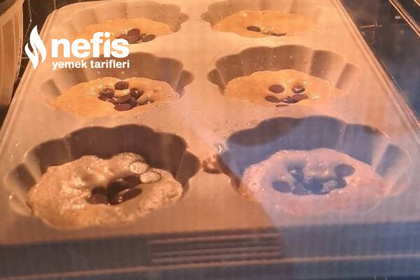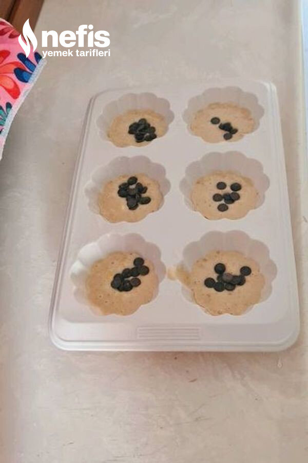 - Silikon kalıplarını oğlum için kakao eklemeden harç ve damla çikolata ile yarıya kadar doldurdum.