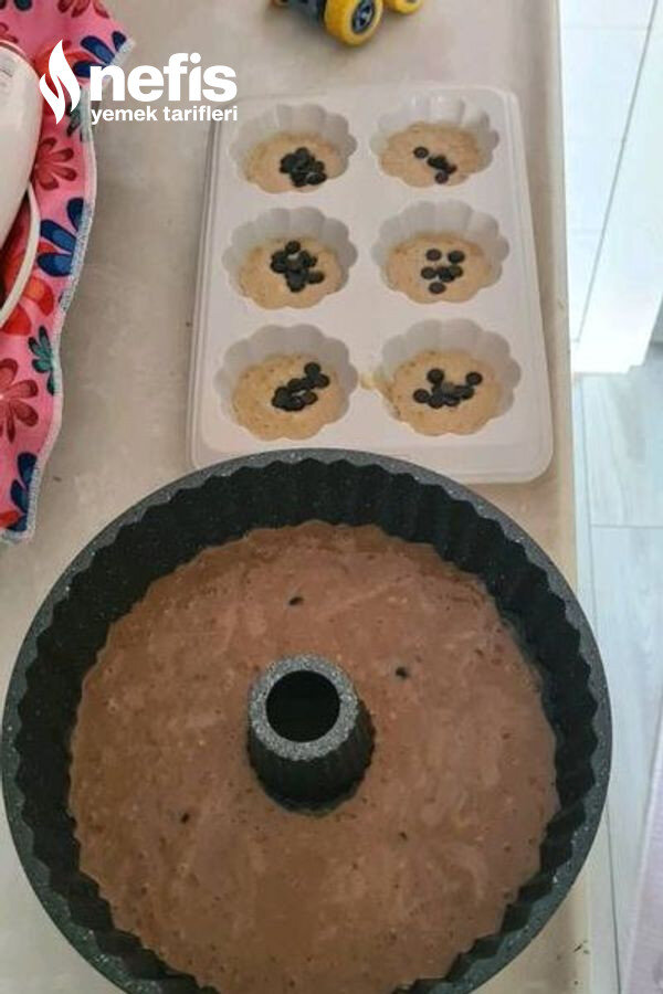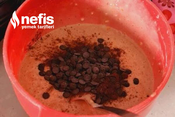- Kalan harca kakao ve damla çikolata ekleyerek yuvarlak kek kalıbına döktüm.