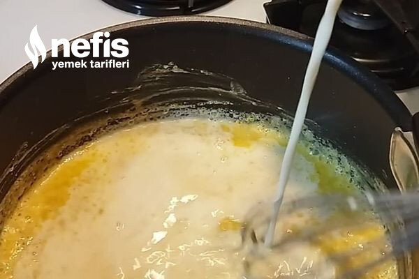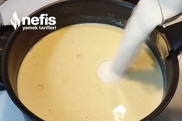 - Sonra sütü yavaş yavaş karıştırarak ekleyin akabinde şekeri de ekleyip kıvam alana dek pişirin.