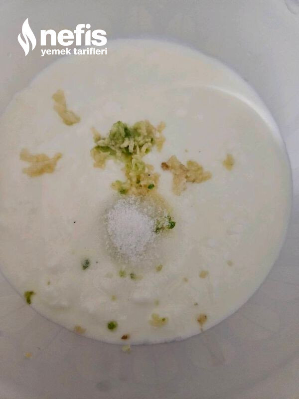 - Diğer yandan sarımsak rendelenir tuz ile birlikte yoğurda eklenip karıştırılır bir kenara alınır.