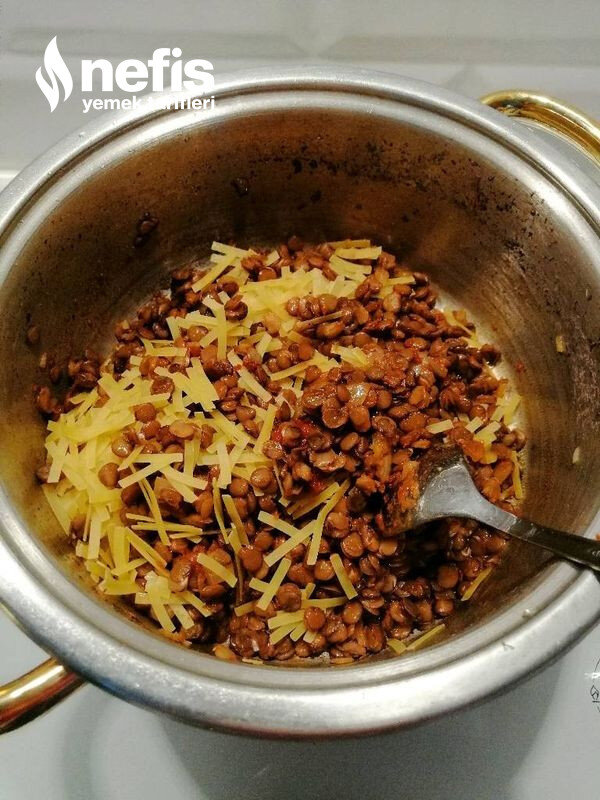 - Haşlanan mercimekler süzülerek soğanların üzerine eklenerek 2-3 dakika kavrulur.