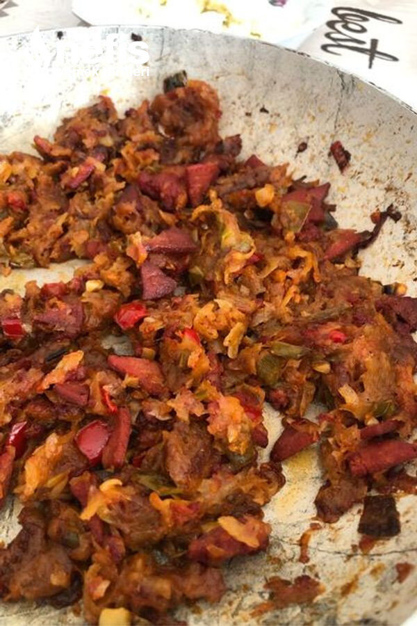 - Karıştırırken patateslerin pişmesine yakın sarımsak ve baharatlarımızı ekleyip küçük küçük doğradığımız sucukları tavamıza ekliyoruz .